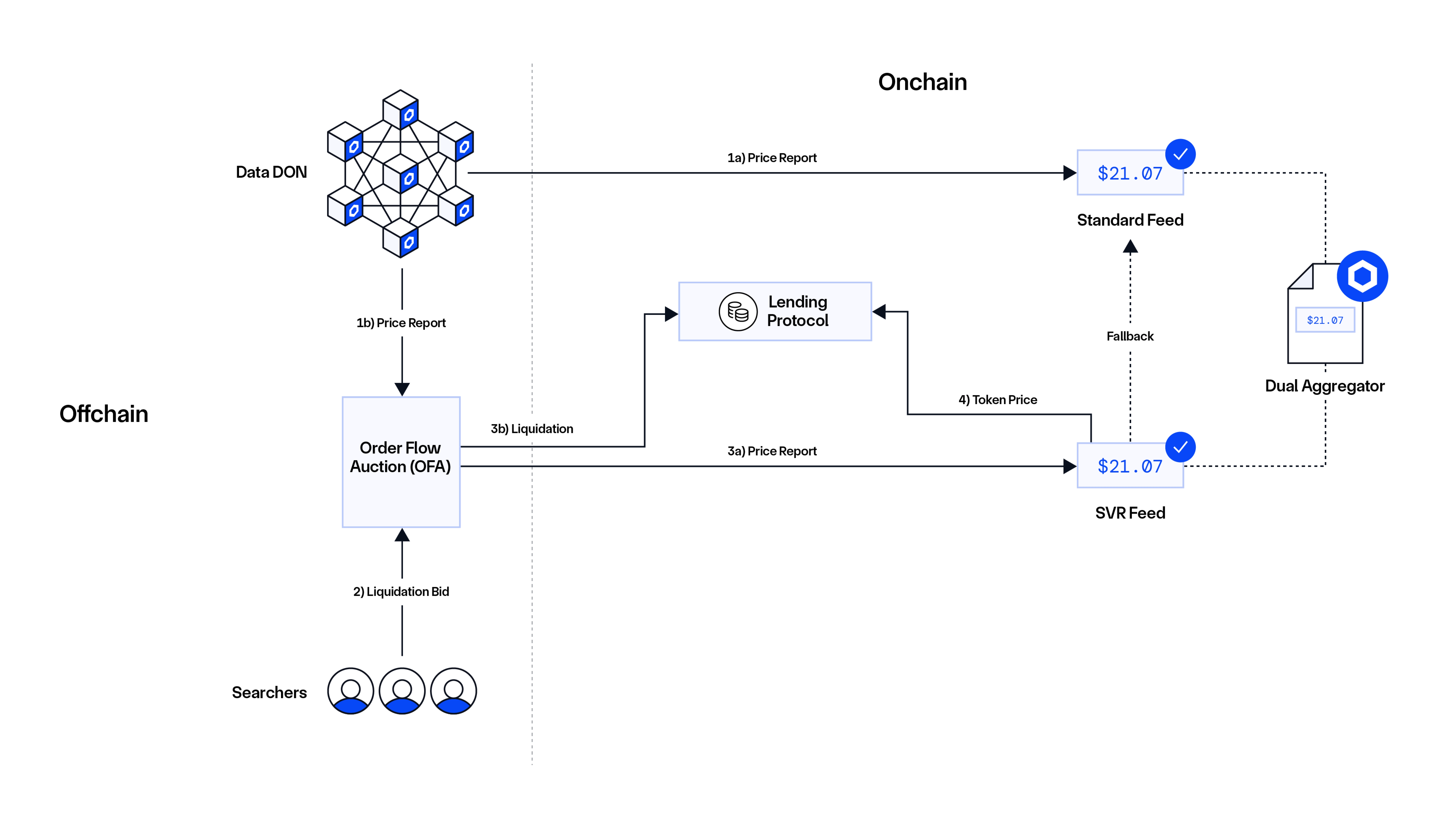 • (3a) SVR Price Report: The winning bundle is published onchain, and the SVR Feed is updated with the new price.